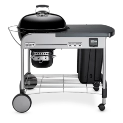 Doté d’une étagère métallique inférieure, le chariot ouvert pratique du Performer Premium GBS offre suffisamment d’espace pour accueillir les plateaux de service, poêles, maniques et spatules de réserve. Et grâce au minuteur de cuisson LCD rétroéclairé amovible intégré, vous n’oublierez plus jamais vos aliments sur le feu. Les deux grandes roues résistantes à toutes les conditions climatiques ainsi que les deux roulettes pivotantes autobloquantes vous permettront de déplacer facilement le barbecue sur votre terrasse et éviteront qu’il ne bouge lorsque vous retournez vos grillades. La cuve et le couvercle du barbecue à charbon Performer Premium GBS bénéficient d’une garantie limitée de 10 ans (rouille et perforation).